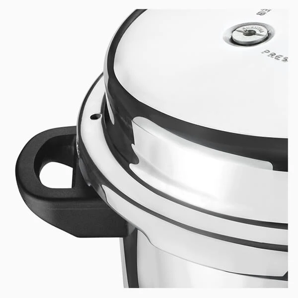 - Gasket Release Vent System – When any food particles blocks the vent tube or the weight valve does not function or the required pressure exceeds i.e[1.5 kg.f/cm2 – 2.5 kg.f/cm2] the pressure is reduced by the gasket by letting it through the Gasket Release Vent System in a smooth, gentle manner and the steam is released upwards which ensures safety to the customers.
